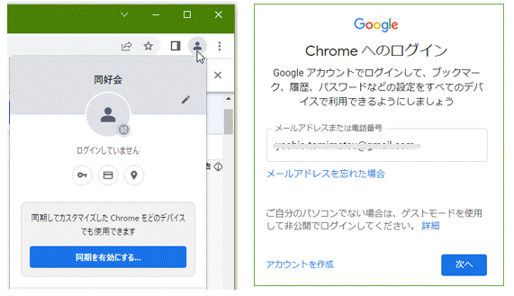 同期設定は下図左のChrome画面右上のマウスで示す「プロファイル」アイコンのクリックから始めます。すでに同期設定がされている場合は「同期は有効です」と表示されるので何もする必要はありません。同期設定がまだの場合には、マウスの下に現れる小画面で「同期を有効にする」をクリックします。下図右でGoogleアカウントのメールアドレスを入力して「次へ」を押します。