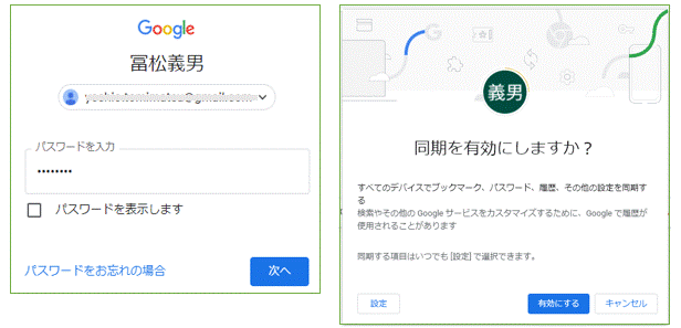 下図左でGoogleアカウントのパスワードを入力して「次へ」を押します。下図右の「同期を有効にしますか?」の画面で「有効にする」を押します。以上でPC側の同期設定は終わりです。