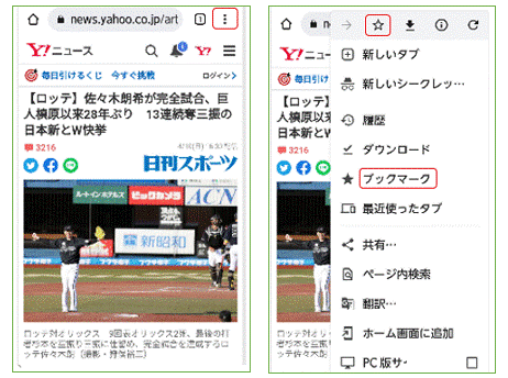 AndroidスマホでWebページをブックマークに登録する手順を示します。右図左のように見たいページを表示して、右上方の「3点マーク」をタップし、次に現れる右図右の上段にある「星マーク」をクリックします。