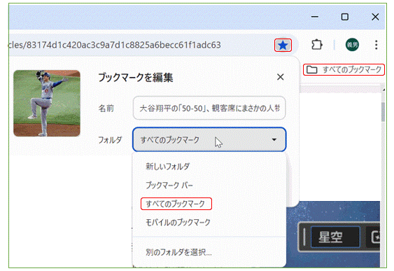 保存場所を上図「すべてのブックマーク」ボタンの左側にしたいときは、「ブックマークバー」を選択します。ただ、横方向の表示幅が少ないことに注意が必要です。