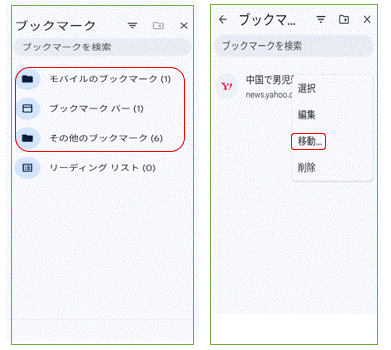 ページの「3点マーク」~「★ブックマーク」から右図左を表示して、ミス登録した「ブックマークバー」をタップします。右図右の「←ブックマ・・・」画面に移り、当該ページの「3点マーク」から「移動」をタップします。「←・・・に移動」画面で「モバイルのブックマーク」をタップし、「←モバイルのブックマ・・・」画面で下方の「ここに移動」をタップして終りです。