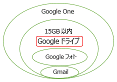 Googleが提供するクラウドのストレージは、右図のように「Gmail」と「Googleフォト」、およびWord,Excel など「その他のデータ」を含めて