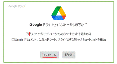 PCの「ダウンロード」フォルダに、「GoogleDriveSetup.exe」 がダウンロードされます。このファイルをダブルクリックすると、まだネット上にあるプログラム本体をダウンロードして、実際にインストールが始まります。上図が出たときはチェックボックスの上段のみ✓して、「インストール」ボタンを押します。