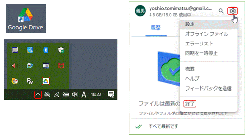 このアプリを停止するには、下図左下の「Google Drive」アイコンをクリックし、下図右の「歯車」アイコンから「終了」ボタンを押します。このアプリをアンインストールするには、前以て「終了」操作をしておく必要があります。再インストールするときは、その前に