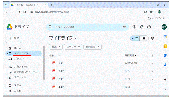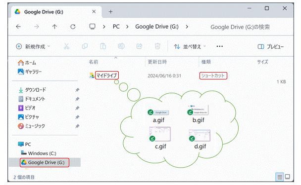 マイドライブ」のフォルダが見えます。この「マイドライブ」はクラウドの「マイドライブ」フォルダのショートカット(PC内には実在しない)です。