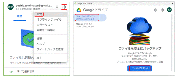 特定のフォルダをアップロードして同期する機能 があります。この機能は会社などグループでの共同利用に有効で、この設定はタスクバーの「通知領域」の「Google Drive」から、下図左の「歯車」~「設定」から始め、下図右画面に移り「マイノートパソコン」を選択