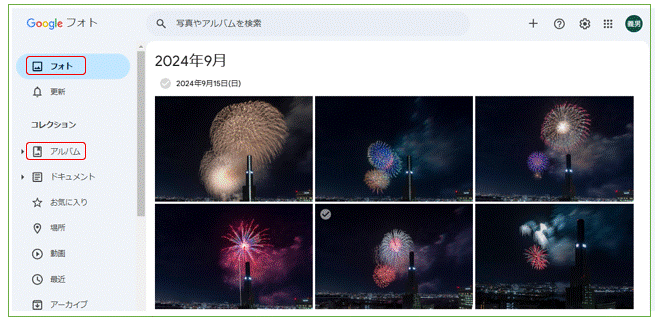 上図で花火の写真 6枚を共有してみましょう。複数の写真を共有する場合はまずアルバム(いくつかの写真をまとめたもの)を作ると便利です。上図で左ペインの「アルバム」をクリックし、「アルバム」の画面で右上の「アルバムを作成」をクリックします。