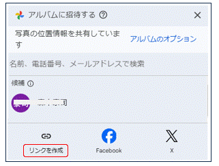 右図上「アルバムに招待する」画面がが出るので、「リンクを作成」の文字をクリックし、次の「共有リンクの作成」画面で「リンクを作成」をクリック