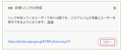 右図下「共有リンクの作成」画面が出ます。この画面の青色英字列が共有リンク、すなわち写真のWebページのアドレス URLです。ここで右方の「コピー」ボタンを押すと、この URLは PCのクリップボードに保存されます。その後、新しいメールを開いて、本文欄に