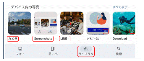 AndroidスマホのGoogleフォトに保存される写真のデフォルトの種類を調べてみました。下図はGoogleフォトのトップ画面で「ライブラリ」をタップし、「デバイス内の写真」を横置画面にしたものです。Androidスマホ(バージョン8.66)では、スマホの「カメラ」で撮った写真は当然として、「Screenshots」や「LINE」で受け取った写真も、自動的にGoogleフォトに保存されます。