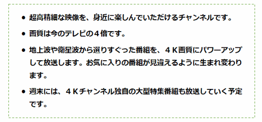 上記に「地上波や衛星放送から選りすぐった番組を4K画質にパワーアップして放送します」とあります。4K放送映像には4Kカメラで撮った内容もありますが、上記を言い換えると「多くは従来の2Kカメラで撮った映像を4K画質にパワーアップして放送します」ということです。