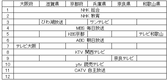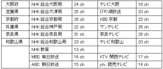 地上デジタル放送のチャンネル番号は、近畿圏では次の表のようになります。表左端の数字がチャンネル番号です。