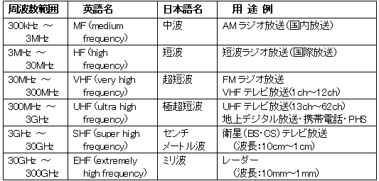 よく使われる電波の周波数を分類すると、およそ次の表のようになっています。従来の地上アナログテレビ放送の周波数は、VHF放送の1ch~12chとUHF放送の13ch~62chという編成になっています。