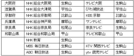 近畿圏のテレビ送信所は次表のようになっています。近畿圏では、主に大阪と奈良の県境にまたがる生駒山(642m)から放送されています。生駒山の広域局は、NHK総合、NHK教育、毎日、朝日、関西、読売の6局です。