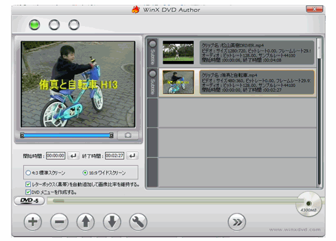 WinX DVD Author は、映像ファイルから家庭用DVDレコーダで再生可能なDVDディスクを作製するフリーのオーサリングソフトです。DVDビデオ(DVD-Video)形式への変換と、DVDディスクへのライティングが簡単にできます。その他必要に応じて、映像のカット編集やDVDメニューの作成なども可能です。