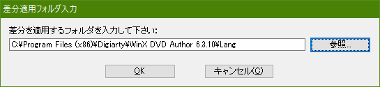 下図「差分適用フォルダ入力」画面で「参照」ボタンを押し、WinX DVD Author 本体があるフォルダ「Program Files (x86)\Digiarty\WinX