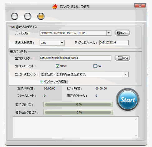 Start」ボタンを押すと、動画をDVDに書き込むプロセスがスタートします。「Start」ボタンが赤色の「