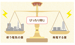 電気を使う(需要)量と電気を作る量(供給)は、同じ時に同じ量にするということです。交流電気の需給バランスは、右図のように「同時同量」でなければならないのです。電気は「究極の生鮮品」ともいわれ在庫を持つことはできません。発送配電の運用から、安全の法基準まですべてはここから始まります。