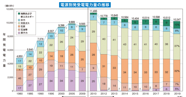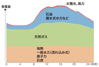 電力会社は予測される電力消費(需要)に応じて、発電計画(供給)を決めます。1年の中でもっとも電力使うのは冷房が使われる夏で、それも工場などが稼働する昼間です。そして、晴れ・曇り・雨など天候の違いによっても需要は変動します。これまた刻々と変化する再エネ分(お天気による急変が多い)を含めた発電量の調節は難しい技術ですが、多くの発電所の出力を増減して全体の需給量を常に一致させ続けています。