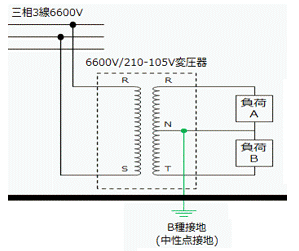 右図は柱上変圧器のB種接地と、家屋内の電気器具(負荷Aと負荷B)の一般的な配線図を示しています。家庭に届く3本線は3色に色分けして使います。