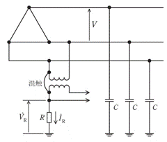 さて、実際の高圧線は広範囲に亘って張られており、電線と大地間に浮遊する静電容量が無視できません。3本線それぞれの浮遊容量をC、B種接地抵抗をRとして右図のような等価回路を考えます。高圧線が低圧線に混蝕したときの地絡電流は、変圧器の2次側のB種接地から大地に流れ、高圧線の浮遊容量を経由して高圧線に戻ります。