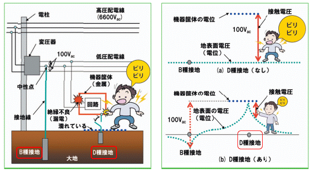 下図(NTT東日本サービスから転載)は B種接地は存在するという前提で、D種接地の意味を分かりやすく示しています。下図左は機器の筐体に漏電が発生していますが、D種接地線が切断されており、そこに人が触れてビリビリと感電しています。こんな様子が描かれています。