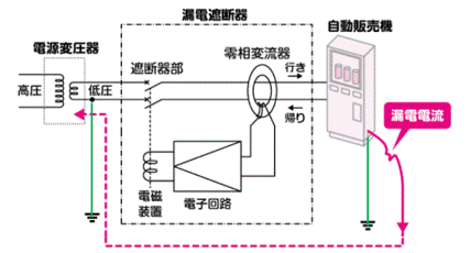 右図は電気機器(自販機)の絶縁が破壊して漏電したときの、漏電遮断器が働く仕組みを示しています。正常時は零相変流器を通る電流は、行き帰り同じ(変流器の1次側電流はゼロ)です。ただ、自販機に漏電が発生すると電流は行きと帰りに差が出ます。この差を漏洩電流といいます。 さて、人が活線に直接触れたときの電流は人体を通って大地に流れます。そのとき人体に流れる電流はどの程度になるのでしょうか。人体への通過電流値とその影響は以下のように考えられています。