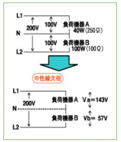 負荷が「不平衡」ときに中性線Nが遮断されると、右図下のように 負荷Aと負荷Bが直列になって200Vが印加されることになります。その結果、電力の小さい機器(抵抗大)に過電圧が加わり、機器を損傷する可能性があるのです。
