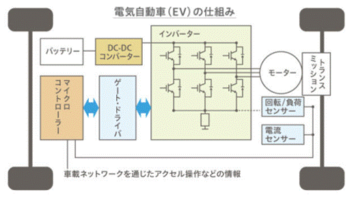 世界中で消費する電力のうち、40%〜50%がモータを回すために使われているといわれています。しかも今後は自動車がエンジンからモータに変わるので、この割合はさらに高まることが予想されます。このようにインバータは電力制御のキーテクノロジーとして今後も発展し続けるはずです。下図のような電気自動車への適用事例を見つけたので転載して紹介します。