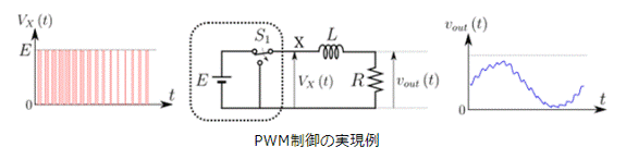 実用的なインバータの出力は、できるだけ正弦波に近づけなければ使いものになりません。出力を正弦波にする考え方を下図で見ていきましょう。下図中央のスイッチS1のタイミングを調整することで、下図左側に示すようなパルス幅が動的に変化する矩形波電圧Vx(t)を作ります。すなわち、下図中央の点Xの電圧は矩形波電圧Vx(t)であり、電流がインダクタLを経ることで平滑化され、下図右側の正弦波に近い電圧Vout(t)となって抵抗負荷Rに加わります。