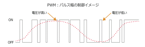 上図左側の矩形波電圧Vx(t)の時間軸を広くして見やすくしたものが下図です。矩形波電圧のパルス幅が、赤点線で示す正弦波の高さに追随するように変化している様子が見てとれます。こんなパルス波を作る技術をパルス幅変調(PWM:Pulse Width Modulation)といい、交流出力の電圧や周波数を自由に変化させ、出力につなぐモータなどを制御することをPWM制御といいます。