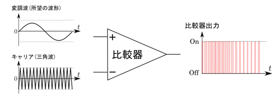 少し難しいですが、この信号を実現する代表的な方法が 下図に示す「三角波比較方式」です。この方法は下図左側の変調波(所望の波形)とキャリア(三角波)の高低を比較することで、比較器出力を生成します。下図右の比較器出力は、変調波の方が高ければON、低ければOFFとなるような信号になっています。