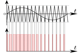 変調波・キャリア・比較器出力の時間的な関連をより分かりやすくするために、この3つを1つの図にしたものが右図です。比較器出力は前項で示した「パルス幅の制御イメージ」の図と同じで、矩形波電圧のパルス幅が正弦波で変調されたものになっています。
