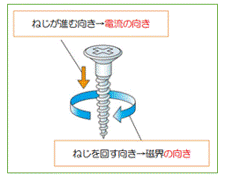 銅線に電流が流れるとその回りに、自然法則に基づいた磁界ができます。右図は右ねじが進む向きに電流が流れると、ねじを回す向きに磁界がでることを示しています。これを「右ねじの法則」といいます。