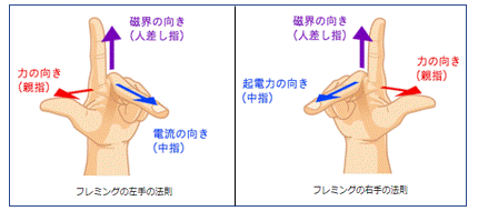 モータが回ったり発電機が電気を作ったりする自然法則があります。下図左はモータに適用されるフレミングの左手の法則で、下図右は発電機に適用されるフレミングの右手の法則です。この2つの法則で