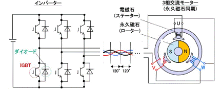 ということでこのページでは、いきなり交流でモータが回る原理を説明することにします。ここでのキーワードは「永久磁石・インバータ・回転磁界」の3つです。一般の人もなんとなく、交流モータが回る理屈を分かってもらえたら幸いです。