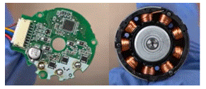 インバータは直流から3相交流を出力する電子回路で、同期モータにつないで速度制御をします。実際の扇風機のDCモータの筐体を分解すると、右図のようなモータ部分と電子部品を載せたプリント基板がでてきます。プリント基板の反対側(モータのコイル側)は位置検出用のホール素子が3個あります。