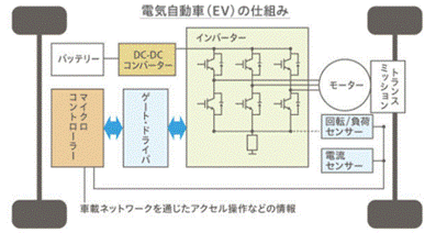 エヤコン・洗濯機・冷蔵庫などの電源は100Vの単相交流ですが、機器内のインバータで3相交流を作り3相交流モータを回しています。EV(電気自動車)も下図のように直流のバッテリー電源から、インバータで3相交流を作り3相交流モータを回しています。