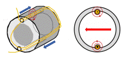 3相交流モータの固定子にはコイルが3つありますが、分かりやすくため上図UVW相3つのコイルのうち1つU相のみで考えてみます。右図左側の○は固定子のスロットで中にコイル(黄色)が2重に巻かれています。