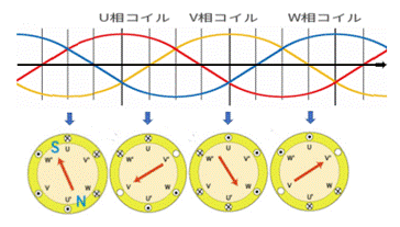 3相交流は3相巻線をした固定子に、回転磁界を作るのです。なお、電源UVW相のいずれかを入れ替えると、回転磁界は反転してモータは逆回転します。