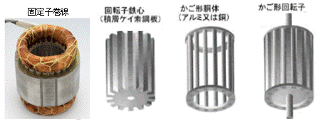 誘導電動機の固定子巻線に3相交流を加えると、固定子の回転磁界によって回転子導体に起電力が発生して そのアルミ導体に電流が流れます。この電流と回転磁界の間に電磁力が発生し、回転子は回転磁界の方向に引っ張られて回転を始めます。