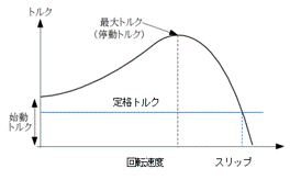 誘導電動機の回転速度とトルクの関係は右図のようになり、同期速度ではトルクはゼロになります。このとき回転子に負荷をかけると、速度は同期速度より少し遅れて回転します。この遅れる程度を滑り(スリップ)と呼び %で表します。この滑りは通常は定格トルクのあたりで数%ほどになります。