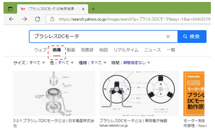 このページの多くの画像はネット上から借用して加工しました。右図のように「ブラシレスDCモータ」で検索して、その直下の「画像」を選択すると、多くの関連する画像が現れます。