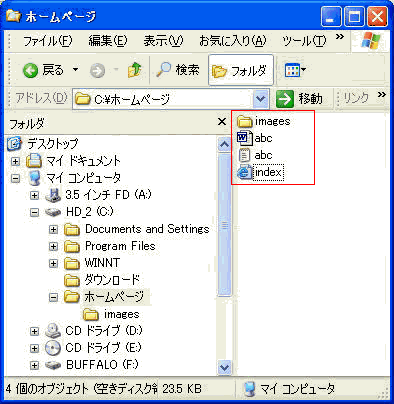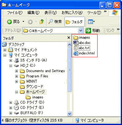 | 4.ファイルを分類・整理しよう 前にも書きましたが、Windowsパソコンではファイルの数が約5,000個もあります。これらをどのように分類して保存するかを考えて見ます。ファイルはフォルダという「入れ物=箱」に入れると考えてください。フォルダはツリー構造(階層構造)をしており、1つのフォルダには数個~数10個のファイルを入れます。フォルダの下にフォルダが幾つあっても構いません。 下図を改めて見てください。フォルダのツリー構造は会社の組織に例えて、次のように考えるとわかりやすいでしょう。 ドライブ=会社、 フォルダ=組織、 ファイル=社員 下図で考えてみます。「HD_2(C:)」という名の会社があり、5つの部組織「Documents and Settings」「Program Files」「WINNT」「ダウンロード」「ホームページ」があります。そのうち、「ホームページ」という部には、部直属の課員、abc.doc、abc.txt、index.html の3名がいます。さらにこの部には「images」という課があるが、その下部組織はここでは表示していません。 なお、このパソコンには「3.5インチFD(A:)」、「CDドライブ(D:)」、「CDドライブ(E:)」、「BUFFALO(F:)」という会社もある、と考えます。 ![]() さて、上図の2つのフォルダ「ダウンロード」と「ホームページ」は私が作りました。パソコンWindowsXPを購入したときのフォルダは、「Documents and Settings」「Program Files」「WINNT」の3つでした。このように、フォルダは必要に応じて新しく作り、その中にファイルを分類して格納します。 新しいフォルダは、メニューの「ファイル」 ~「新規作成」~「フォルダ」 で作ります。フォルダを右クリック ~「名前の変更」で、任意の名前を付けることができます。 フォルダの前の「+,-,記号なし」は、それぞれそのフォルダの下に別のフォルダが「ある,開いている,ない」を意味しています。フォルダをたどって特定のファイルに至る経路を「パス」といい、例えばファイル「abc.doc」は次のように表します。 C:\ホームページ\abc.doc 円記号「\」は、ドライブとフォルダ、フォルダとフォルダ、フォルダとファイルの区切りを表し、Windowsの約束事の一つです。ここで注意しなければならないのは、同じ名前のファイルがあっても、パスが違えばコンピュータは異なるファイルとして扱う、ということです。 自分のパソコンのフォルダのツリー構造は、常に頭に描いておくようにしましょう。会社で仕事をするときには、組織を考えてことにあたります。ファイルを操作するときも、このツリー構造を頭に描いておくことは非常に大切なことです。 こんなものは正確には覚えられません。大まかでいいのです。会社に例えれば、せめて部課組織ぐらいは覚えておきましょう。 |