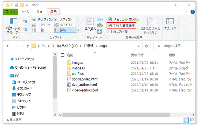 | 3.ファイルの拡張子を表示しよう (注)2022.5.1 下記を点線まで追記しました。 Vistaから Office2007 のメニューが「リボン」に変わりましたが、Windows8からはエクスプローラのメニューも「リボン」に変わりました。拡張子の付け方も下図のようになりました。 下図の例では「表示」タブの「ファイル名拡張子」にチェックを付ければ、PC内のすべてのファイルに拡張子が付与されます。 ![]() ------------------------------------------------------------------------------------------ 下図は、WindowsXP Professinal のフォルダ構成の一例です。デスクトップの「マイコンピュータ」から、メニューの「表示」~「一覧」をクリックし、ボタン列の「フォルダ」を押し、さらに、「HD_2(C:)」~「ホームページ」と順次クリックしたときの状態です。 「デスクトップ」とは、パソコンを起動したままの各種アイコンが並んだ状態をいいます。その下に「マイドキュメント」と「マイコンピュータ」が見えます。 「マイドキュメント」と「マイコンピュータ」は 見かけ上は同列にありますが、「マイドキュメント」は実際には、「ハードディスク HD_2」の「Documents and Settings」の下にあります。詳しくは8項で説明します。 ![]() 「マイドキュメン」(Windows10 ではドキュメント)は一般のユーザーが、プログラムを使って作成したデータをすぐ保存できるように、Microsoft が前以て作ってくれているフォルダです。ファイルを格納するフォルダは、一般に物理的なフォルダと同じ形状をした茶色のアイコンで示されています。 「マイコンピュータ」(Windows10 では「PC」)以下は、このパソコンのフォルダ構成を示しています。このパソコンには、Aドライブ(3.5インチ フロッピーディスク FD)、Cドライブ(ハードディスク HD_2)、Dドライブ(CD-ROM)、Eドライブ(DVDドライブ)、Fドライブ(BUFFALO外付ハードディスク)があります。 さらに、Cドライブ(ハードディスク HD_2)には、「Documents and Settings」「Program Files」「WINNT」「ダウンロード」「ホームページ」の5つのフォルダがあります。 さて、上図のフォルダ「ホームページ」の3つのファイルには、拡張子がない(表示されていない)ことに注目してください。このままではファイルの種類がはっきりしません。パソコンを購入したままのデフォルト状態では、このような表示になっています。 ここで、ファイルの拡張子を表示 しておきましょう。メニューの「ツール」~「フォルダオプション」~「表示」タブの「詳細設定」で、「登録されている拡張子は表示しない」のチェックを取り、「適用」~「OK」をクリックします。 ![]() ここで改めて、下図のフォルダ「ホームページ」の3つのファイルに注目してください。拡張子 doc(WORD文書)、txt(テキストファイル)、html(HTMLファイル)が表示されました。こうしておくと、それぞれのデータファイルがどのプログラムで作られたか、このファイルを開くときどのプログラムを起動すればよいか、これらのことが一目瞭然です。 ![]() ファイルやフォルダの表示形式には、「縮小版」「並べて表示」「アイコン」「一覧」「詳細」の5つの形式がありますが、普通のフォルダ表示は「一覧」形式が見やすいかと思います。 |