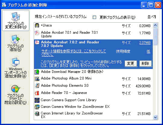 | 10.プログラムのインストールとアンインストール 市販の一般プログラムをインストールするときは、その取扱説明書に従って操作すれば問題なくインストールできます。インスト-ルするとは、プログラムをフロッピーディスクやCD-ROM などから、ハードディクの中に格納することです。 不要になったプログラムは削除することもできます。ただ、既に7項で述べたデータファイルを削除するほど簡単ではありません。一般にプログラムは何個かのフォルダに分散してハードディスクにインストールされていますから、データファイルのような方法で削除することはできません。もしそんな方法で削除するとプログラムの一部が残ったままになり、システムに障害が起こることになります。 プログラムの削除は次に示すように、システムの規則に則って行います。こんなプログラムの削除をアンインストールといいます。WindowsXPでは「スタート」~「設定」~「コントロールパネル」~「プログラムの追加と削除」ダイアログで削除します。 ![]() 上図の左欄上部の「プログラムの変更と削除」をクリックします。右欄にこのパソンにインストールされているほぼ全てのプログラム一覧が表示されます。この中から削除したいプログラムを選択して、「削除」をクリックします。以降はメッセージに従って操作してください。 フリーソフトの一部にあるごく簡単なソフトでは、ここに登録されない場合もあります。このような場合には、取説にしたがってプログラムファイルを手動で削除することになります。 (注)Windows10 でのアンインストールも簡単です。「スタート」ボタン~「設定」~「アプリ」~「アプリと機能」で、現れる画面にインストーされているプログラムがすべて表示されます。ここで削除したいプログラムを選択して「アンインストール」をクリックします。 |