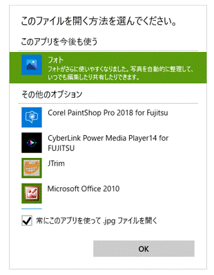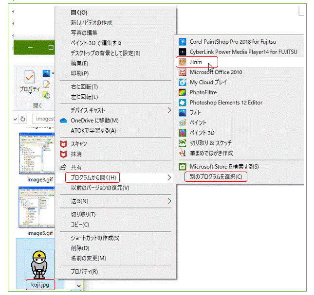 | 7.プログラムと拡張子の関連付け WORDやEXCEL などの Officeでは、プログラムとファイルの拡張子は「1:1」に対応しています。その他 メールソフト・ホームページビルダーなども、インストールするときにインストーラ(インストールプログラム)が、この「1:1」の関連付けを既にしてくれています。こんなプログラムでは拡張子の関連付けは、特に考える必要はありません。 ところが、例えば 「.txt」 「.jpg」「.gif」 「.png」「.html」 「.pdf」などは、この拡張子に対応するプログラムが多く存在します。こんな拡張子を持つデータファイルは、ダブルクリックしたときどのプログラムを起動するか、前以て一意的に決めておくと便利です。これを決める設定が「プログラムと拡張子の関連付け」です。この設定をしておかないとデータファイルを開く都度、起動するプログラムを決めなければなりません。 Windows10で「プログラムと拡張子の関連付け」する手順を示します。ここでは.jpgファイルを「JTrim」に関連付けする例を示します。下図はファイル「koji.jpg」を右クリック ~「プログラムから開く」をクリックしたときの表示です。ここに「JTrim」がありますから、一時的に使う場合はこのアイコンを押せばOKです。ただ、新しく拡張子の関連付けをしたり変更するときは、下方の「別のプログラムを選択」を押します。 ![]() すると、右図の「このファイルを開く方法を選んでください」が表示されます。ここに「JTrim」がありますから、「常にこのアプリを使って.jpgファイルを開く」にチェックして「OK」を押します。これで.jpgファイルが「JTrim」に関連付けられました。仮に、ここにも「JTrim」がなかったとします。そのときは下までスクロールして、「その他のアプリ」を押します。ここでもなかったらさらに下にスクロールして、「常にこのアプリを使って.jpgファイルを開く」にチェックして、「このPCで別のアプリを探す」を押すと、C:ドライブの「Program Files」フォルダが表示されます。 実は「JTrim」は「C:\Program Files(x86) \JTrim \JTrim.exe」にインストールされています。この「JTrim.exe」をダブルクリックすると .jpgファイルが開き、この時点で.jpgファイルと「JTrim」の関連付けができます。必要なら.gif や.pngファイルについても同じ操作を行ってください。 さて、全くのついでですが「JTrim.exe」を探したとき、ダブルクリックする前にデスクトップにショートカットを作っておくと便利です。「JTrim.exe」を選択して右クリック~「送る」~「デスクトップ(ショートカット作成)」をクリックするだけです。 |