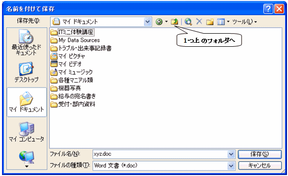 | 5.ファイルを保存する コンピュータにデータやプログラムを保存する場所は、次の2箇所あります。 ・主記憶装置(内部記憶装置、メインメモリ、または単にメモリといいます) ・補助記憶装置(外部記憶装置ともいいます) フロッピーディスク、ハードディスク、CD、DVD、USBメモリなどがあります。 メモリー(主記憶装置)と補助記憶装置の大きな違いは、電源をOFFにしたときの振る舞いです。メモリでは記憶されていた内容が全て失われますが、補助記憶装置では記憶内容は失われません。ですから、メモリはプログラムやデータの一時記憶に使われ、補助記憶装置は永続的な保存に使われます。 WORDやEXCELで作るデータは、作成途中はメモリに蓄えられます。作成が終われば、作成初回は「名前を付けて保存」、以降は「上書き保存」します。「データを保存する」ということは、メモリに一時的に蓄えられたデータを、ハードディスクなどの補助記憶装置に保存するということです。ハードディスクは永続的な保存が可能ですから、理にかなっています。 さて、WORD文書を作り、「ファイル」メニュー~「名前を付けて保存」をクリックしたとします。「名前を付けて保存」の画面が現われ、保存先が一般に「マイドキュメント」になっています。WORDやEXCELなどのデータの一般的な保存場所は、それぞれのアプリケーションで「マイドキュメント」になるように初期設定されているからです。 ![]() 上図で、「マイドキュメント」の「受付・部内資料」に保存するなら、これをダブルクリックして保存先を「受付・部内資料」にして、下段「ファイル名」で「xyz.doc」などの名前を付けて「保存」ボタンを押します。このとき、拡張子は消去しないように注意してください。 もし「マイドキュメント」以外のフォルダに保存したいときは、ハードディスクのフォルダを上下して目的の保存先を探すことになります。左列の「デスクトップ」「マイコンピュータ」など、あるいは上段の「1つ上のフォルダへ」ボタン(上向き緑色矢印)などから、保存先のパスをたどります。 一般的なパスのたどり方は、次のようにします。 ・ 「保存先」ボックス内をダブルクリックして、フォルダパスを下に移動する。 ・ 「1つ上のフォルダへ」ボタン(上向き緑色矢印)をクリックして、パスを上に移動する。 このようにフォルダを上下して目的のフォルダやファイルを探すことは、パソコンを扱う上で頻繁に遭遇します。プログラムを起動してから目的のファイルを開く場合や、メールにファイルを添付する場合など、上記と同じようにフォルダを上下して目的のファイルをたどります。このような操作に慣れておくことは非常に大切なことです。 |