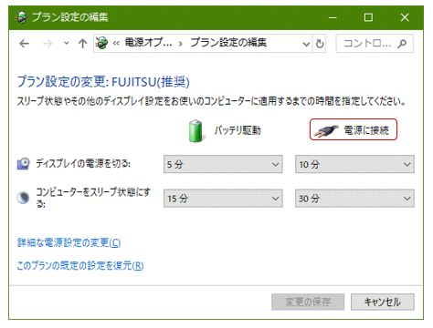 上図デフォルトの電源プランではPCを「電源に接続」した状態で、PCの操作をせずそのままにしておくと、自動的に10分でディスプレイの電源が切れ、さらにそのままにしておくと30分でPCはスリープ状態になるということです。