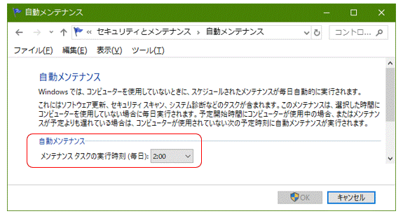コントロールパネル~システムとセキュリティ~セキュリティとメンテナンス~メンテナンス~自動メンテナンスのメンテナンス設定の変更~自動メンテナンス に「メンテナンスの実行時間(毎日)2:00